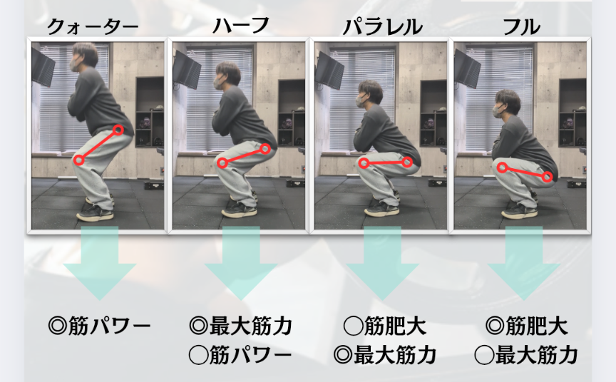 「どこまでしゃがめば効果的?」みたいなやつです。ざっくり言うと、スクワットはしゃがむ深さによって呼び方が変わります: